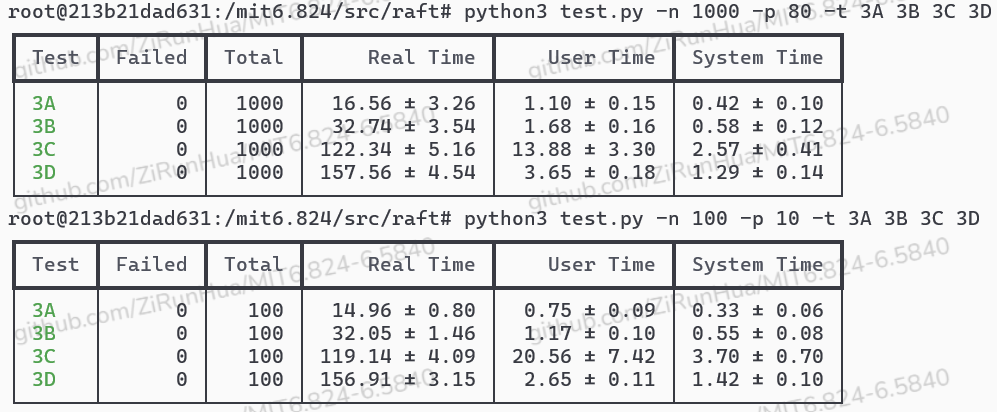 实验的难点并不在于实现,也不在达到测试要求的运行时间,而在于确保所构建系统的稳定性和可靠性。我比较多的时间都花在解决 1000 次测试中出现的那一两个失败上,而这一两个失败可能需要花费好几个小时才能找到答案。